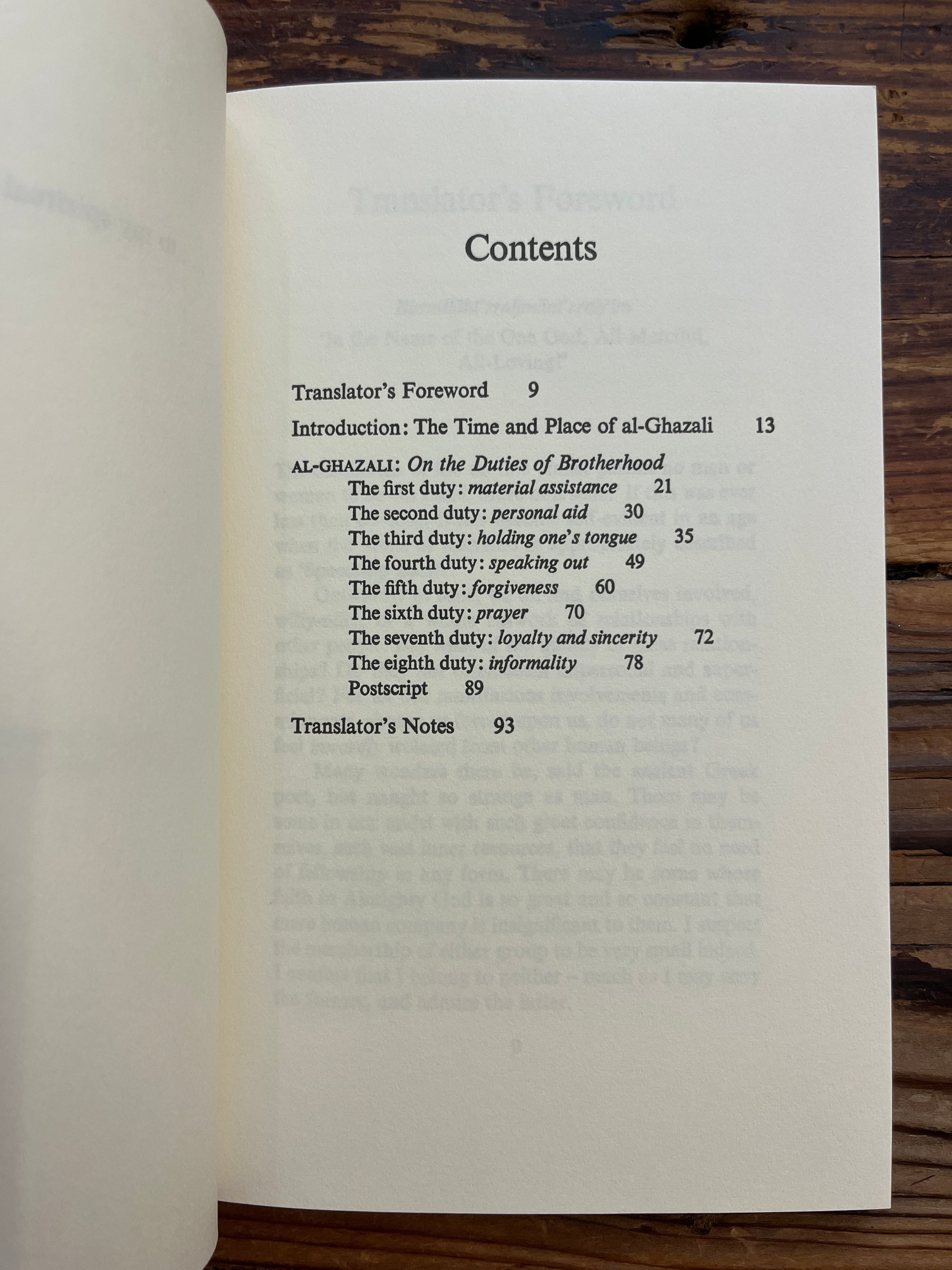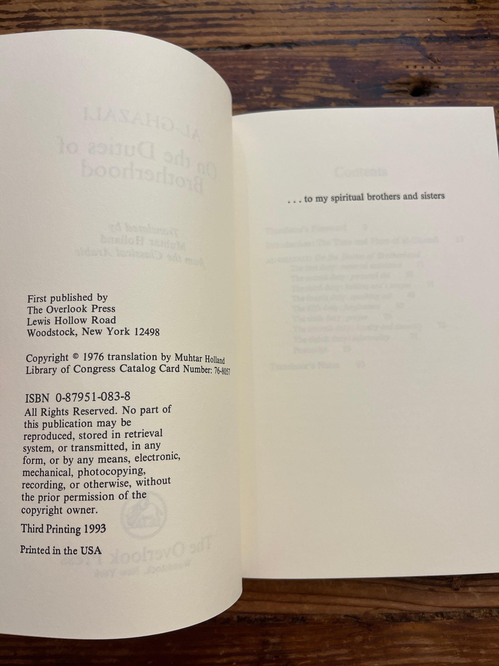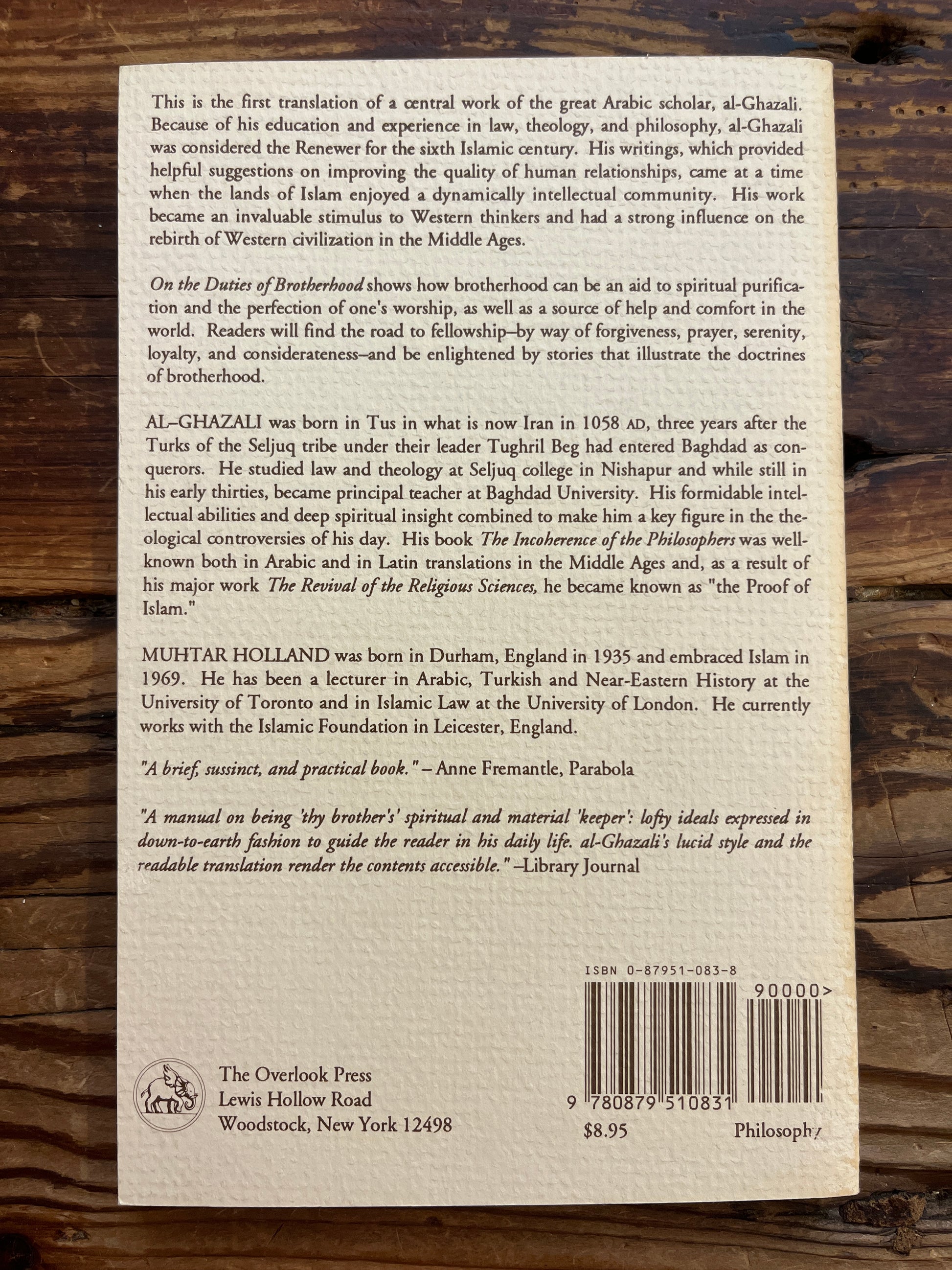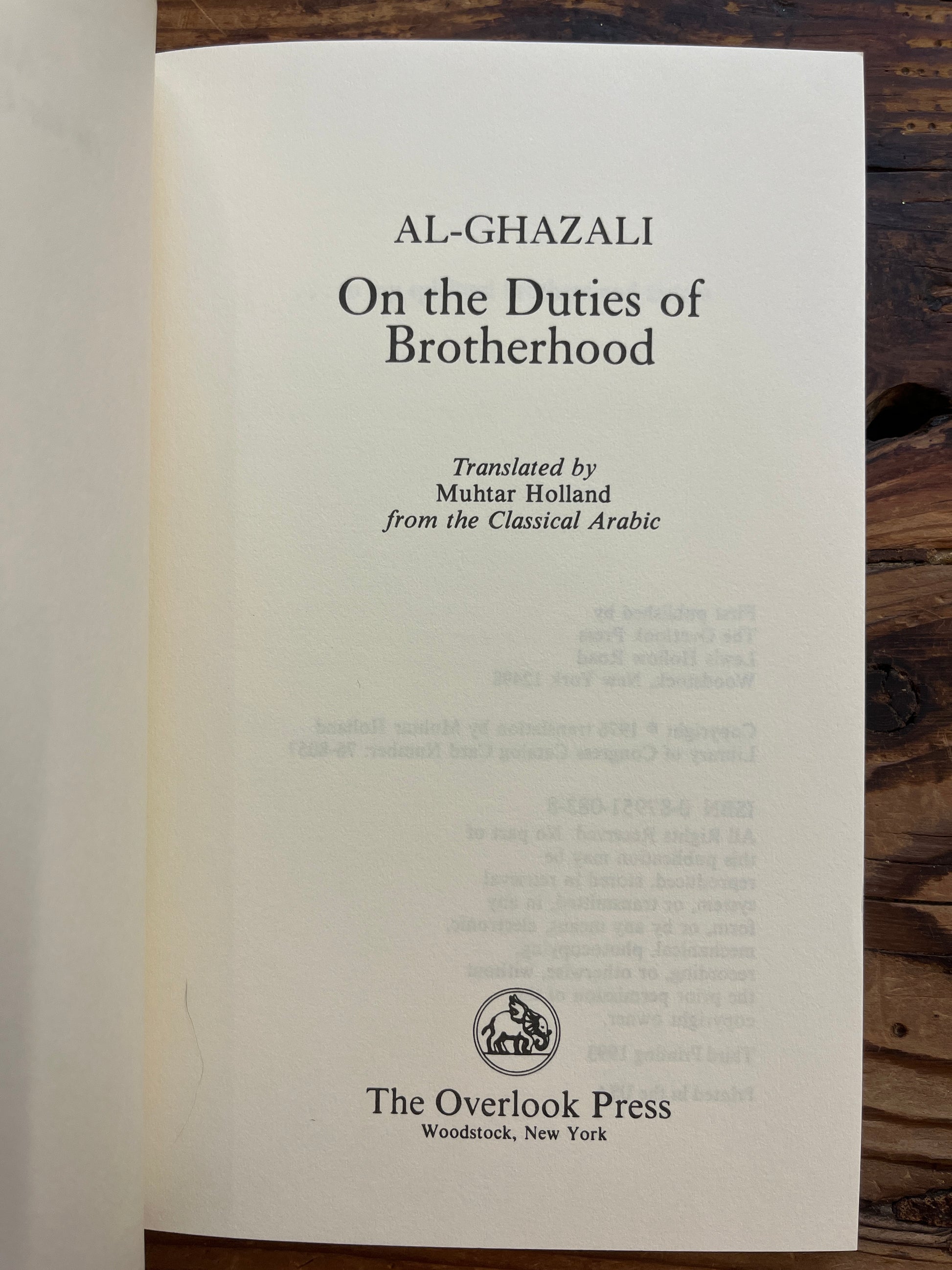 On the duties of Brotherhood, al-Ghazali, translated by Muhtar Holland from the Classical Arabic